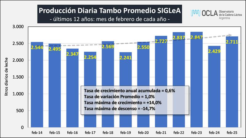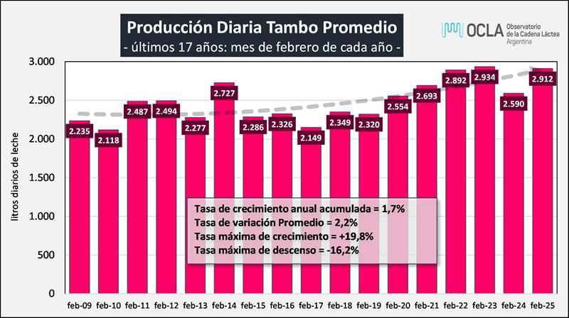 Sobre la base de la producción mensual y la cantidad de tambos que indica el Tablero Dinámico de SENASA, podemos inferir el tamaño del tambo promedio, unos 2.912 litros de leche diarios para febrero de 2025, una producción superior al año anterior (+12,4%). En el período 2017-2025 el tambo promedio creció a una tasa del 3,9% anual, situación que se ve interrumpida en 2024 por diferentes factores.