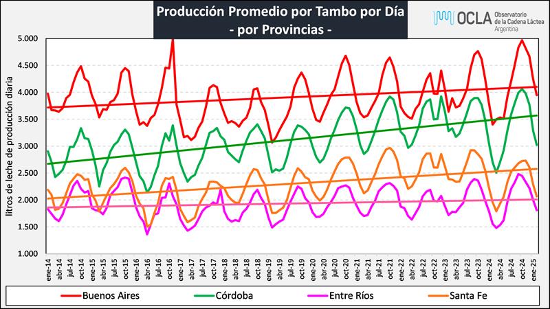 A continuación, el gráfico con las 4 principales provinciales lecheras (90% de la leche total) que permite ver con mayor nitidez la evolución.