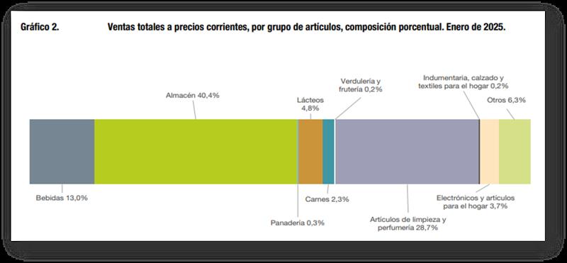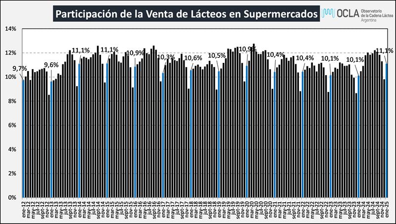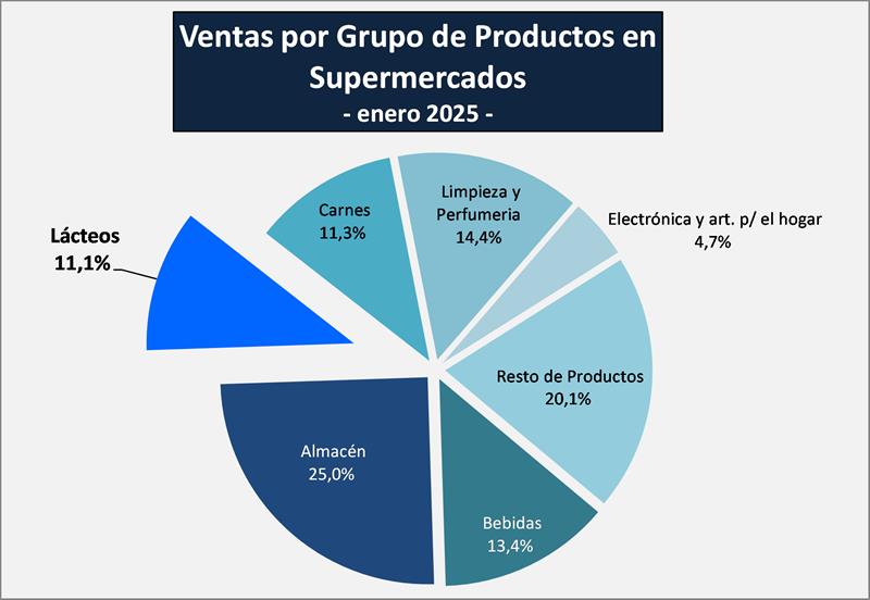 En enero de 2025 las ventas de lácteos en autoservicios mayoristas fueron de $ 12.948,7 millones sobre una venta total de $ 270.188,6 millones, lo que determina una participación del 4,8%.