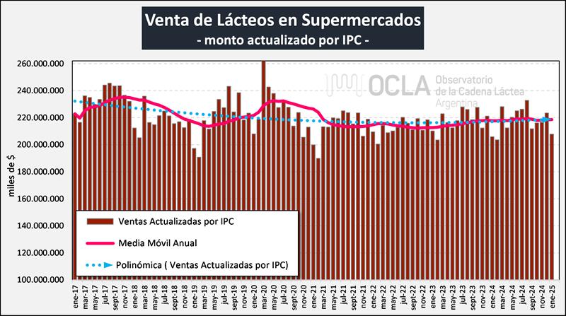 En el mes de enero de 2025 las ventas de lácteos en supermercados fueron de $ 207.783 millones, -4,9% respecto al mes anterior, y +86,3% respecto a igual mes del año 2024, 1,8 puntos por encima del IPC General y 3,8 puntos por debajo del IPC Lácteos y Huevos GBA.