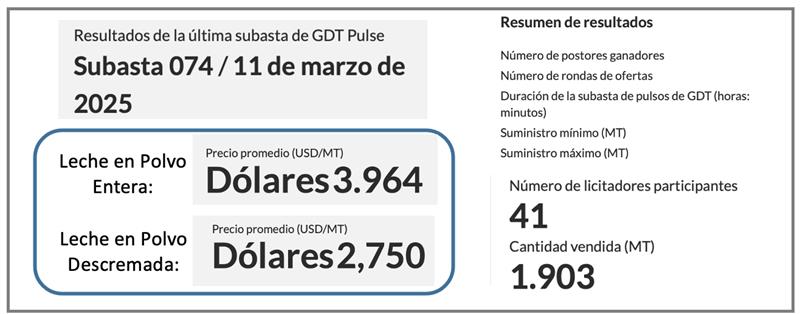 La subasta Nº 075 se ha llevado ha cabo en el día de hoy, martes 25 de marzo, donde el precio promedio obtenido para la LPE ha sido de 3.964 US$/t, el cual representa una leve baja de 0,8% respecto a lo publicado en la última GDT pulse (3.997 US$/t) y representa una disminución de 2,2% respecto al último evento del GDT (4.052 US$/t).