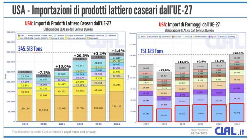 UNION EUROPEA: el comercio de lácteos con Estados Unidos 8/4/2025Han entrado en vigor los nuevos aranceles impuestos por Donald Trump a las importaciones estadounidenses procedentes de la Unión Europea. Entre los diversos sectores productivos afectados se encuentra también el lácteo. En 2024, Estados Unidos importó 345.513 toneladas de productos lácteos de la UE-27, por un valor de 2.800 millones de dólares, o el 50% del valor total de las importaciones de productos lácteos estadounidenses. El principal producto europeo importado por EE.UU. en 2024 fue el queso, con 151.123 toneladas compradas. Italia confirmó su posición como primer suministrador, con 41.071 toneladas exportadas al exterior, distanciando claramente a Francia (24.100 toneladas), España (20.531 toneladas) y Holanda (19.013 toneladas). Estos aranceles podrían afectar los flujos comerciales y los precios, con repercusiones tanto para los productores europeos como para los consumidores estadounidenses. El mercado tendrá ahora que adaptarse a las nuevas barreras. Los actores europeos, como ya ocurrió en 2020, tendrán que estar preparados para buscar otras oportunidades de negocio para compensar una posible desaceleración de la demanda estadounidense. ![]() traducido por el OCLA a partir del artículo de CLAL.