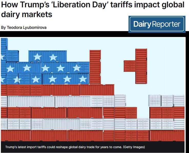 “Día de la Liberación”: Cómo impactan los aranceles de Trump en los mercados mundiales de productos lácteos 8/4/2025![]() Desde la UE hasta China, repasamos cómo la última ronda de aranceles comerciales del presidente estadounidense está afectando a los productos lácteos. Estados Unidos impuso un arancel fijo del 10 % a todas las importaciones, pero algunos de sus socios comerciales, como la UE y China, se enfrentan a tasas más elevadas. El arancel fijo no se aplicaría a Canadá y México, que ya están sujetos a aranceles. El arancel del 10 % entró en vigor el sábado 5 de abril de 2025, y las tasas más altas se aplicarán a partir de la medianoche del 9 de abril. Analizamos cómo es probable que los aranceles afecten a las principales regiones productoras de lácteos del mundo, como la UE, China, Australia y Nueva Zelanda. Unión Europea 20% Estados Unidos lleva mucho tiempo en conflicto con la UE por las indicaciones geográficas (IG) del queso. Las IG, que abarcan alrededor de 3.500 productos agrícolas, vinos y bebidas espirituosas, son un tipo de marca registrada y una forma para que los productores europeos promuevan el patrimonio cultural de sus regiones. Hace una década, la UE causó revuelo entre los queseros estadounidenses al querer restringir también el uso de términos como "parmesano" en el queso fabricado en Estados Unidos. El bloque ha impulsado dichas protecciones en las negociaciones comerciales con otros países, como India. La política de la UE ha sido considerada hostil por algunos grupos comerciales estadounidenses. El Consorcio para Nombres Comunes de Alimentos, una organización sin fines de lucro que defiende el derecho de los productores a usar nombres comunes, afirma que la UE ha sido "una de las principales infractoras de los derechos de los productores de alimentos y bebidas que usan nombres comunes". El Consejo de Exportación de Lácteos de EE. UU. afirma que el problema "va más allá del léxico". “Si Europa garantiza el uso exclusivo de feta, parmesano, gorgonzola, asiago y otras denominaciones comunes de queso, podría reducir el consumo de queso estadounidense en un 21% en 10 años y costar a los productores lecheros estadounidenses un total acumulado de 59.000 millones de dólares”, estima la organización. ¿Por qué son importantes las denominaciones de origen (IG)? La Comisión Europea afirma que el reconocimiento de las IG permite a los consumidores “confiar en los productos de calidad y distinguirlos, a la vez que ayuda a los productores a comercializarlos mejor”. Las indicaciones geográficas incluyen DOP (denominación de origen protegida), IGP (indicación geográfica protegida) e IG (indicaciones geográficas). Las ventas de productos agroalimentarios y bebidas con IG generan cerca de 75.000 millones de euros (81.500 millones de dólares) para el bloque, de los cuales unos 15.000 millones provienen de exportaciones a destinos no pertenecientes a la UE. Estados Unidos, China y Singapur son los principales destinos de los productos con IG de la UE. Alexander Anton comentó: “Las exportaciones de productos lácteos de la UE, especialmente el queso, representan menos del 2% del consumo interno total de EE. UU. Estos quesos abastecen a un segmento de mercado muy exclusivo en EE. UU., ofreciendo variedad y excelencia a los consumidores estadounidenses y, por lo tanto, no compiten directamente con los productos lácteos estadounidenses. “EE. UU. y la UE no solo tienen la mayor relación bilateral de comercio e inversión y la relación económica más integrada del mundo, sino que la balanza comercial general (bienes y servicios) entre EE. UU. y la UE está prácticamente en equilibrio; esta es la base ideal para una relación comercial próspera. “Por lo tanto, una disputa comercial entre EE. UU. y la UE es claramente una situación en la que todos pierden”. Añadió que el momento no podría ser peor. “Nuestro sector ya se encuentra bajo una enorme presión debido a la investigación antisubvenciones de China y a los continuos desafíos del mercado global. Ahora, los aranceles estadounidenses corren el riesgo de agravar esa crisis. “Esto supone un duro golpe para las economías rurales de toda Europa y para el espíritu de un comercio justo y basado en normas”. Alexander Anton, Asociación Europea de Lácteos. El organismo comercial ha instado a la Comisión Europea a responder estratégicamente. «La política comercial debe ser inteligente, no punitiva», añadió Anton. «Los lácteos no son el problema; usarlos como instrumento solo crea nuevos problemas a ambos lados del Atlántico». Generando 1.900 millones de euros, el whisky (900 millones de euros) y los lácteos (830 millones de euros) representan el 91% del total, seguidos de la carne de cerdo (23 millones de euros), la carne de vacuno (8,8 millones de euros) y el marisco (3,8 millones de euros). La Asociación Irlandesa de Agricultores (IFA) prevé que productos como la mantequilla Kerrygold se verán afectados. "Kerrygold es ahora la segunda marca de mantequilla más vendida en EE. UU., adonde enviamos productos por valor de casi 500 millones de euros en 2024", declaró la IFA en un comunicado. "Este mercado representa aproximadamente el 7,5% de nuestras exportaciones totales de lácteos. "El hecho de que Nueva Zelanda solo tenga un arancel del 10% para los productos lácteos y el Reino Unido solo tenga un arancel del 10% para las bebidas, mientras que la UE tendrá aranceles del 20%, nos dejará en desventaja competitiva frente a algunos de nuestros principales competidores en estos dos sectores". Los aranceles son una ganga para la UE, ya que la mano dura debería corregir las políticas comerciales distorsionantes. Si bien algunas organizaciones lácteas estadounidenses, como la IDFA, han instado a no prolongar las guerras arancelarias (más sobre esto más adelante), otros sectores de la industria han reaccionado positivamente a los arance