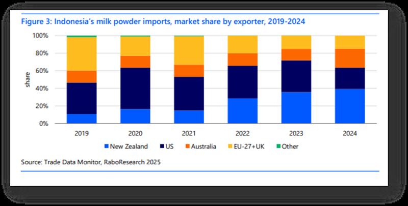 Según RaboResearch, el país importó más de 2.000 millones de litros de leche (en equivalente a leche líquida) en 2024 (véase la figura 1). Más del 80% de este volumen de importación correspondió a leche en polvo. Por ello, Indonesia desempeña un papel crucial en el mercado mundial de productos lácteos.