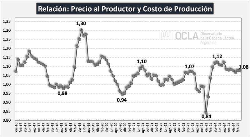 El gráfico siguiente muestra la relación entre el precio percibido y el costo de producción, que cuando el factor supera 1 el precio es superior al costo. Esta relación que llegó a 1,12 en mayo próximo pasado, cae a 1,09 en noviembre, pero sostiene valores por encima de 1 para 11 de los 12 meses de 2024. Arranca la relación en 2025 con un índice de 1,07 a pesar de la baja en moneda constante del precio al productor y se sostiene un 1,08 en febrero-marzo.