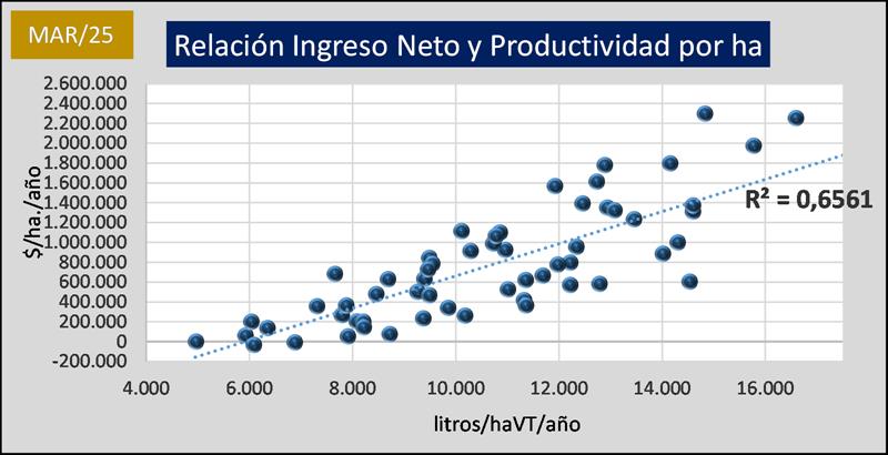 Por último, incorporamos el gráfico donde se obtiene la mayor correlación entre las variables económicas y productivas, en este caso la relación entre el Ingreso Neto y la Productividad (medida en litros de leche por hectárea por año).