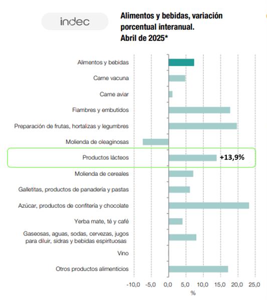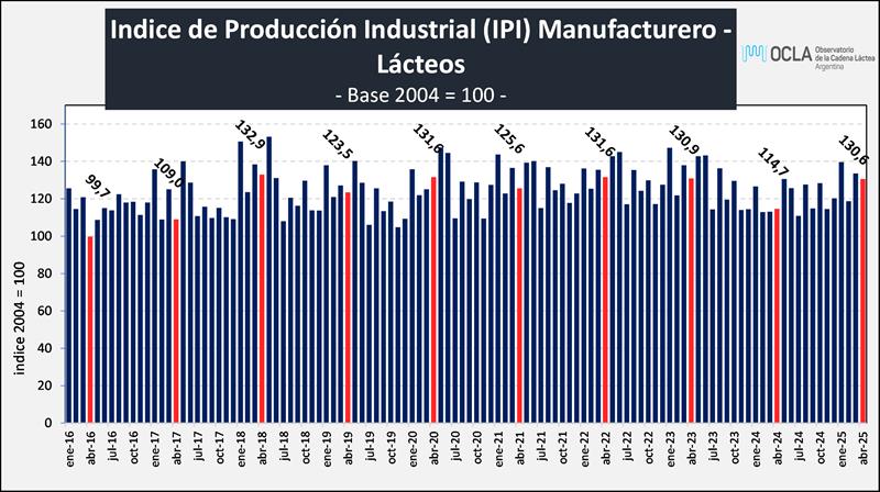 Índice de Producción Industrial Manufacturero - Lácteos 9/6/2025Índice de producción industrial manufacturero – GENERAL – abril de 2025 En abril de 2025, el índice de producción industrial manufacturero (IPI manufacturero) muestra una suba de 8,5% respecto a igual mes de 2024. El acumulado del primer cuatrimestre de 2025 presenta un incremento de 6,7% respecto a igual período de 2024. En abril de 2025, el índice de la serie desestacionalizada muestra una variación positiva de 2,2% respecto al mes anterior y el índice serie tendencia-ciclo registra una variación negativa de 0,5% respecto al mes anterior Índice de Producción Industrial Manufacturero – LÁCTEOS - abril de 2025 En los productos lácteos el índice fue de 130,6 lo que indica una baja del 2,2% con el mes anterior (+1,0% en el promedio diario) y la variación interanual fue de +13,9%. El acumulado del primer cuatrimestre de 2025 subió un 11,8% respecto a igual período del año anterior, cuando la producción lo hizo un 11%, lo cual implica una mejora de precios muy leve del orden del 0,8% El IPI Manufacturero de los Productos Lácteos estuvo entre los cuatro de mayor incremento interanual en abril respecto al año pasado del rubro Alimentos y Bebidas Abril del 2025, es un 6,9% superior al promedio de los 9 meses de abril del período 2016-2024 (130,6 vs 122,2). ![]() La elaboración de productos lácteos tiene un incremento interanual de 13,9%, debido, principalmente, a una mayor elaboración de quesos, leche en polvo y leches fluidas. Según empresas consultadas, el incremento responde a una mayor recepción de leche cruda. En este sentido, según datos de la Dirección Nacional de Lechería de la SAGyP, la producción primaria de leche registra una suba interanual de 15,2%. ![]() El IPI manufacturero es un indicador de coyuntura, con periodicidad mensual, que tiene como principal objetivo medir la evolución de la producción de la industria manufacturera de manera objetiva, oportuna, con precisión, coherencia, comparabilidad, de modo imparcial, dentro del marco de los principios reconocidos y las recomendaciones internacionales en la elaboración de estadísticas públicas oficiales. elaborado por el OCLA con información de INDEC
