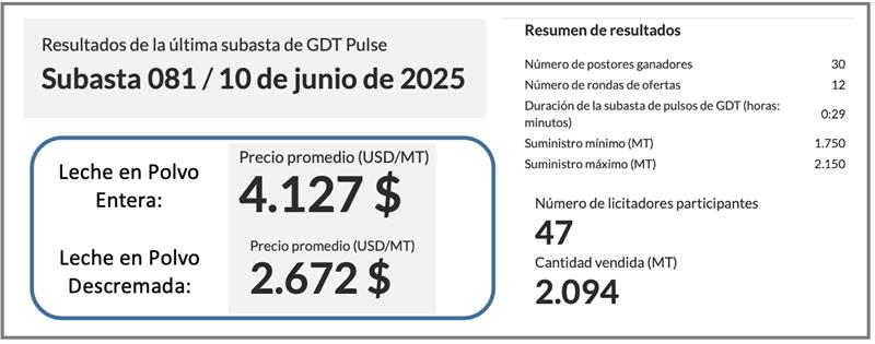 La subasta Nº 081 se ha llevado ha cabo en el día de ayer, martes 10 de junio, donde el precio promedio obtenido para la LPE ha sido de 4.127 US$/t, el cual representa una baja de 2,1% respecto a lo publicado en la última GDT pulse (4.215 US$/t) y una baja de 1,1% respecto al último evento del GDT (4.173 US$/t).