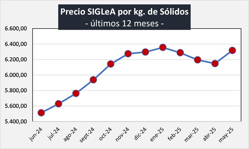 Respecto al precio de los sólidos (grasa butirosa y proteína), no solo venía cayendo en moneda constante, sino que también entre febrero y abril cayeron en moneda corriente debido a que los precios no acompañaron la importante suba de sólidos, en mayo próximo pasado la suba en el precio por litro, acompañada de una baja en los contenidos de grasa butirosa y proteína, hicieron que el precio por Kg. de Sólidos utilizados para la liquidación, subiera tanto en moneda corriente como en moneda constante.