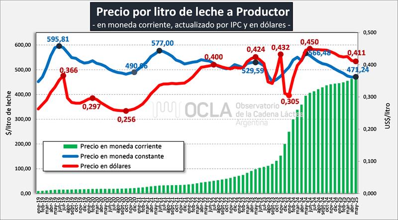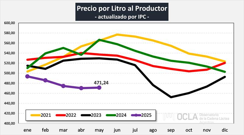 En una visión de más corto plazo el gráfico anterior muestra el precio por litro de leche actualizado a mayo 2025 por inflación y que los precios de febrero, marzo y mayo de 2024 habían sido los más altos de los últimos 5 años, y qué en los últimos siete meses de 2024, fueron inferiores al año 2021 y los precios de los primeros cinco meses de 2025 son los más bajos de los últimos 5 años para esos meses.