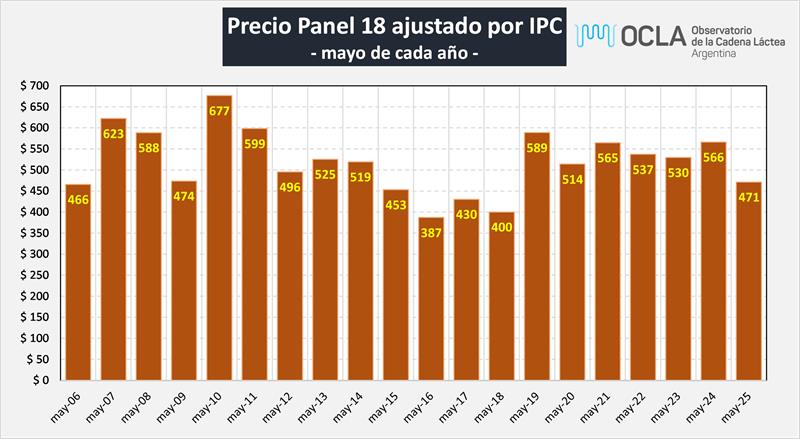 OCLA utiliza el precio Panel 18 Empresas ya que es el que continúa la serie histórica y puede estar menos influenciado por valores no incluidos en la liquidación de leche.