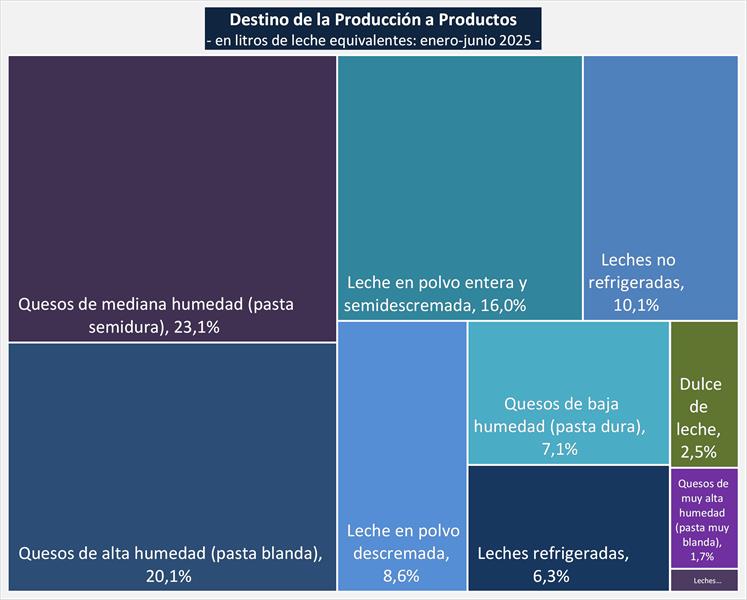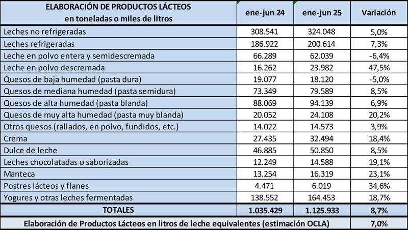 Elaboración de Productos Lácteos – a junio de 2025 30/7/2025La información proviene del Panel de industrias lácteas establecido a partir del relevamiento coyuntural de la Resolución 230/16 e información histórica de la Resolución 7/14, ambas de la SAGyP. Los valores se expresan en toneladas y miles de litros, dependiendo del tipo de producto. La conversión a litros de leche equivalente se realiza con los coeficientes establecidos en la Disposición 1/2018 de la DNL-MPyT. La Resolución 230/16 según informa la DNL cubre el 78,5% del Total de LUME, con lo cual podemos inferir que representa aproximadamente el 60% de la producción total. La elaboración según la Resolución 230/16 de la DNL presentó para el mes de junio de 2025 un volumen 1,9% superior al mes pasado y en litros de leche equivalente un 4,9% más (+8,4% en el promedio diario). ![]() El interanual arroja una suba de 5,2% en volumen de productos y de + 7,7% en litros de leche de equivalentes. Según los datos del cuadro de arriba hay una suba en el primer semestre de 2025 del 8,7% en productos elaborados y del 7,0% en litros de leche necesarios para elaborarlos. Cabe recordar que la producción total a nivel nacional subió en igual período un 11,4% en litros de leche totales del período. ![]() Si nos remitimos a la información que surge del cuadro de arriba ha habido una suba generalizada donde los rubros de mayor crecimiento fueron otros productos como yogures, postres, manteca y dulce de leche. Cayó la leche destinada a quesos duros y leche en polvo entera, esto último debido al flujo exportador más reducido que se incrementó algo al final del período analizado. A continuación, observamos en el gráfico, la evolución en los últimos 11 años con una tendencia descendente en elaboración de leches fluidas y en otros productos (frescos y otros), un crecimiento en quesos en general y un sostenimiento en leches en polvo. ![]() Por último, en el gráfico de abajo vemos la distribución porcentual a cada producto en litros de leche equivalentes para el período enero-junio de 2025, quesos 52%, leches en polvo 25%, leches fluidas 16% y resto de productos el 7%. ![]() elaborado por el OCLA con información de la DNL – SAGyP