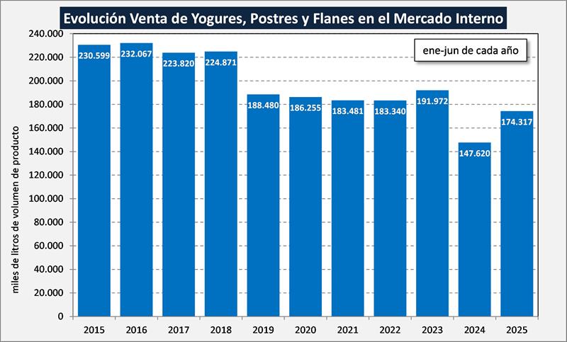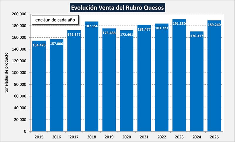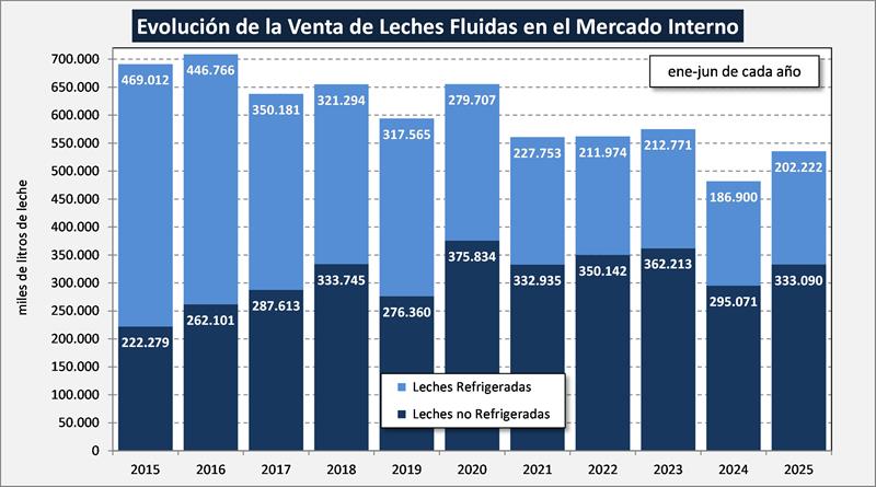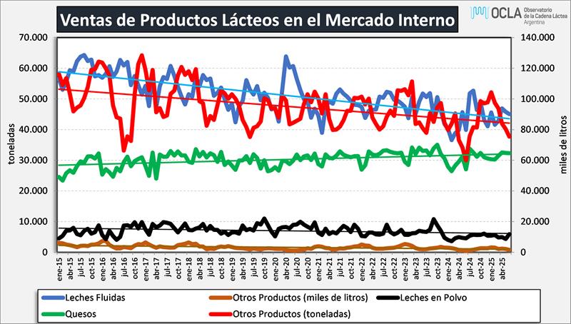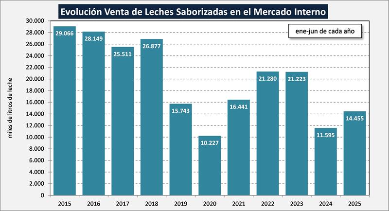 Ventas de Productos Lácteos en el Mercado Interno – junio 2025 30/7/2025La información proviene del Panel de industrias lácteas establecido a partir del relevamiento coyuntural de la Resolución 230/16 e información histórica de la Resolución 7/14, ambas de la SAGyP. Los valores se expresan en toneladas y miles de litros, dependiendo del tipo de producto. La conversión a litros de leche equivalente se realiza con los coeficientes establecidos en la Disposición 1/2018 de la DNL-MPyT. La Resolución 230/16 según informa la DNL cubre el 78,5% del Total de LUME, con lo cual podemos inferir que representa aproximadamente el 60% de la producción total. Las ventas según la Resolución 230/16 de la DNL presentaron para el mes de junio de 2025 un volumen 1,8% inferior al mes pasado y en litros de leche equivalente subieron un 2,0% (+5,4% en el promedio diario). La comparación interanual (jun/25 vs jun/24) indicó un incremento del 17,9% en volumen de productos y una suba del 18,3% en litros de leche equivalentes. Ya se venía marcando en los últimos meses una importante desaceleración en la caída interanual del primer semestre de 2024, y se consolidó la recuperación en el acumulado del año 2024 y en este primer semestre de 2025. ![]() Puede observarse, analizando por grupo de productos (cuadro de abajo), una mejora en las ventas en todos los rubros, fundamentalmente leches en polvo (enteras) y otros productos (manteca, yogures, leches saborizadas, dulce de leche y crema). ![]() Cabe aclarar que la Resolución 230 captura una porción mayoritaria de las ventas totales, quedando fuera ventas que posiblemente puedan tener un comportamiento diferente al descrito en el cuadro. Además, escenarios como el actual donde hay un fuerte deterioro de los ingresos reales de la población, hacen que proliferen las “ventas informales” que obviamente ninguna estadística puede registrar y además han crecido fuertemente productos (análogos) que por precio sustituyen el consumo de lácteos, como rayados, bebidas con lácteos, margarinas y otros similares. Ventas enero a junio de los últimos 3 años, tomando a 2023 = 100: ![]() Claramente en el cuadro anterior se puede observar que las ventas en general (que captura la Resolución 230), cayeron 17 puntos en los primeros seis meses de 2024 y en 2025 ya llevan recuperados 11 puntos, incluso en quesos ya se logró prácticamente la recuperación. En particular los rubros de más lenta recuperación son aquellos de mayor valor agregado y/o unitario. Cabe también agregar que la recuperación en algunos rubros fue básicamente a costo de mayores ofertas de precios. El Balance Lácteo que dispone de los valores de producción, existencias, importaciones y exportaciones de información oficial, calcula por diferencia el consumo. Para el período enero-junio de 2025 estimamos un aumento interanual del consumo doméstico total del 12,9%, casi idéntico al crecimiento del 13,0% de las ventas que registra la Resolución 230. En los dos gráficos siguientes se presentan las ventas de leche fluida (en miles de litros), a abril de cada año (refrigeradas y no refrigeradas), donde se puede ver por un lado el descenso en el total de leches fluidas (al menos las que captura la Resolución 230) que se viene dando en los últimos años, pero en 2025 comienza con una reversión en esa tendencia. Por otra parte, en el gráfico que le sigue a éste, se evidencia claramente cómo fueron creciendo en participación las leches no refrigeradas en detrimento de las leches refrigeradas, pero en estos últimos años hubo un freno en ese proceso, tornando estabilizada la relación en 62/38 la relación. ![]() ![]() En el gráfico de abajo se ve cómo productos como las leches saborizadas o chocolatadas, que presentaron un descenso a la mitad durante la pandemia, luego una importante tasa de crecimiento en el año 2021 (61%), y que fue sólo por efecto de comparar con un año donde las ventas fueron extremadamente bajas y que no solo se sostuvo sino mejoró en 2022 y 2023, en 2024 se desploman un 45%, casi a niveles de pandemia, recuperándose algo en el último semestre. Situación bastante parecida presenta el gráfico que le sigue de yogures, postres y flanes, que tienen una recuperación casi idéntica en los últimos seis meses que las leches saborizadas. ![]() ![]() Para los quesos, el principal rubro de destino de elaboración y comercialización de productos, se da una situación de mayor estabilidad y una notable recuperación en el período enero-junio de 2025, donde las ventas son prácticamente iguales a la de los primeros seis meses de 2023. Se prioriza por precio, al peso (fraccionados) y con prevalencia de productos más commodities (cremoso, barra y duros “frescos”) que especialidades. Además, es dable acotar que por los exiguos resultados que genera la exportación debido al retraso cambiario, hubo mucho cambio de destino hacia el mercado interno y con precios más bajos. ![]() A pesar de los comentarios, respecto al cuidado que hay que tener al analizar las bajas y subas de ventas de los diferentes productos en el período actual, lo que es contundente es que las ventas y por ende el consumo, presentan en los últimos años una tendencia a la baja en general y una primarización del mismo (productos más básicos: leches fluidas, quesos al peso de segundas y terceras marcas y yogures bebibles de litro) en detrimento de aquellos productos de mayor valor agregado y por ende económico. Esta situación sin duda se da por un fuerte deterioro de los niveles de ingresos reales, fundamentalmente de los segmentos medios de la pirámide de ingresos, lo cual, al margen de reducir el volumen de consumo, afecta el valor del mix de ventas haciendo que se facture un menor valor en las ventas internas, que claramente reflejamos en los análisis de la cadena de valor cuando mencionamos los bajos valores del VLE Mercado Interno en dólares respecto a otros paíse