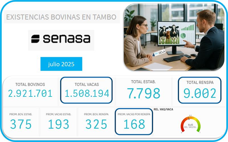 Con la información disponible de algunos meses, principalmente a marzo de cada año previas a contar ahora con el Tablero Dinámico Mensual podemos extrapolar por tendencia los meses previos. En base a lo descripto, la variación respecto al mes anterior es de -0,10% unidades productivas y -1,54% de vacas. La variación interanual de julio 2025 respecto a julio 2024 es de -2,59% unidades productivas y +2,49% de vacas (36.697 cabezas más que julio 2024, y 46.490 cabezas menos que en julio de 2023).