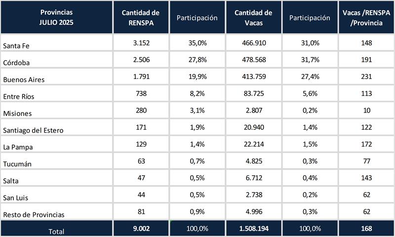 En el cuadro superior se puede visualizar la distribución de tambos y vacas por provincia, al igual que la participación relativa y la cantidad de vacas por unidad productiva. El 91% de los tambos y el 95,7% de las vacas en producción se concentran en la Cuenca Central (Santa Fe, Córdoba, Buenos Aires y Entre Ríos). También podemos ver un crecimiento importante de la cantidad de vacas por tambo que asciende a 168 cabeza, cifra que creció un 9,8% respecto al promedio de los 10 años anteriores.