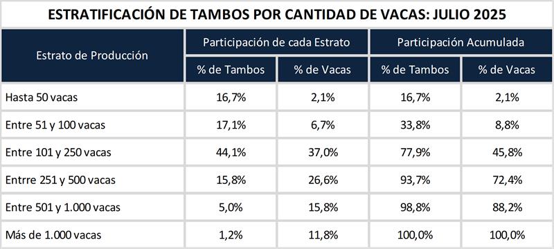Abajo la estratificación en función a la cantidad de vacas, indicando la participación en función a la cantidad de tambos y luego de animales en producción. Como más significativo puede mencionarse que los tambos con más de 500 vacas totales en producción son sólo el 6,2% de los tambos, pero tienen el 27,6% de las vacas y aportan más de un tercio de la producción total de leche. En el otro extremo se encuentran los tambos de menos de 100 vacas totales en producción que son el 33,8% de los tambos, tienen el 8,8% de las vacas y generan menos del 10% de la producción total.