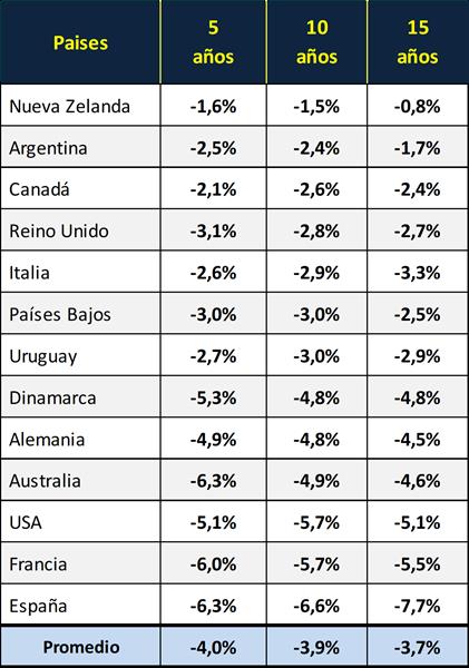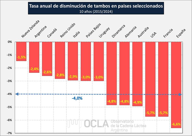 En el gráfico y cuadro siguiente, sobre la base de la cantidad de unidades productivas de los últimos 15 años, se calcula la tasa anual para el período de 5, 10 y 15 años respectivamente, donde se puede observar el promedio simple de la tasa de disminución de tambos de los países disponibles que asciende al 4,0% anual en los 10 años.