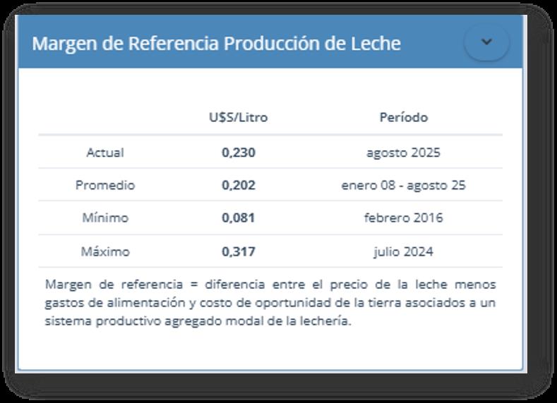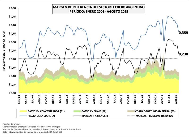 En el cuadro puede observarse que el margen promedio para el mes de agosto del 2025 fue US$ 0,2303/litro de leche, este margen es un 9,4% inferior al del mes anterior y un 27,1% más bajo que igual mes del año anterior. El acumulado del año es 0,8% inferior al igual período del año pasado y agosto de 2025 a pesar de las bajas, todavía está 13,8% en encima del promedio de la serie que es de US$ 0,2023.
