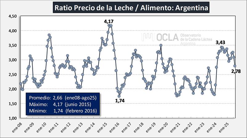 En este último gráfico puede observarse claramente que desde julio de 2024 se viene dando una tendencia de caída de esta relación entre el precio de la leche al productor y el costo de alimentación calculado en la determinación del MRL.