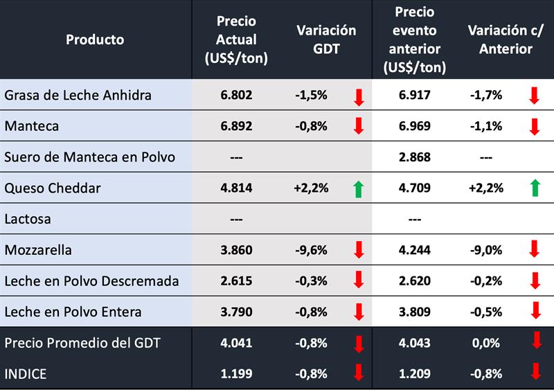 -GDT Price Index indica el promedio del cambio porcentual en los precios para cada especificación, ponderado por la cantidad de cada especificación vendida. GDT proporciona un cambio en el índice de precios de GDT del evento anterior para todos los productos, además de un equivalente para cada grupo de productos y cada combinación de grupo de productos/período de contrato. El índice de precios proporciona un reflejo más preciso de los movimientos de precios entre los eventos comerciales.
