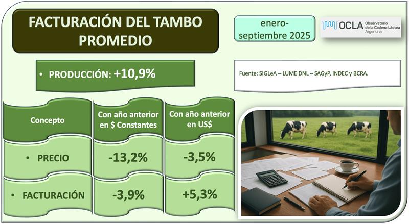 El tambo promedio SIGLeA-LUME que en septiembre de 2025 tuvo una producción diaria de 3.869 litros, facturó un 5,9% por debajo del año anterior. En el acumulado del período enero-septiembre, medido en moneda constante facturó un 3,9% por debajo de igual período del año anterior debido a una baja en el precio de 13,2% pero con una mejora de producción del 10,9%. En dólares en ese período la facturación fue 5,3% superior a igual período del año anterior.