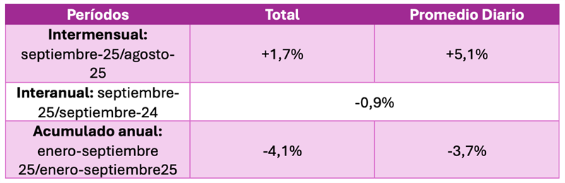 El índice en septiembre 2025 sube respecto al mes anterior el 5,1% en promedio diario algo por debajo de la suba de la producción (+5,7%), ya que el precio promedio del VLE estuvo en moneda constante -1,9% por debajo al mes anterior. En la variación interanual la caída del índice fue del 0,9% y contrapone un crecimiento de la producción del 9,9% con una baja del VLE del 12,7%.