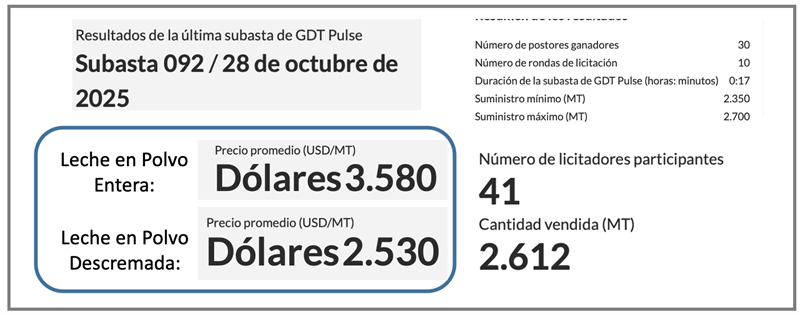 La subasta Nº 092 se ha llevado ha cabo en el día martes 30 de octubre, donde el precio promedio obtenido para la LPE ha sido de 3.580 US$/t, el cual representa una baja de 2,6% respecto a lo publicado en la última GDT pulse (3.677 US$/t) y de 0,8% respecto al último evento del GDT (3.610 US$/t).