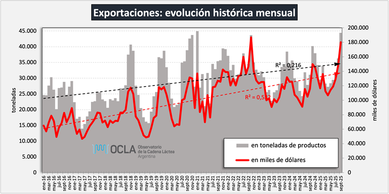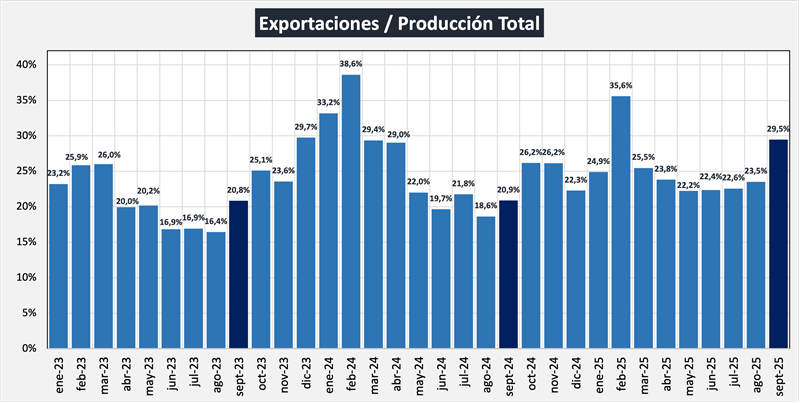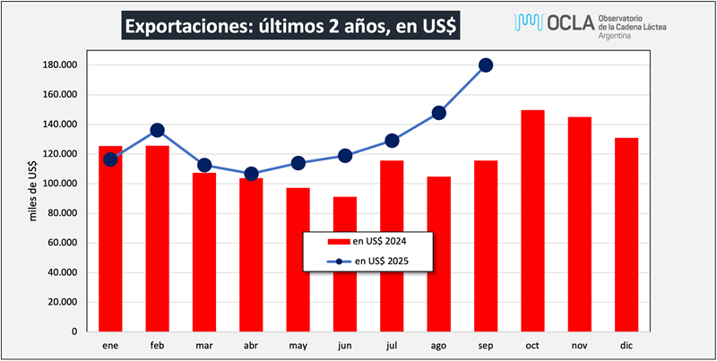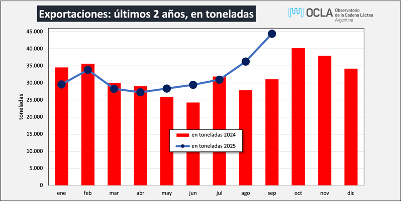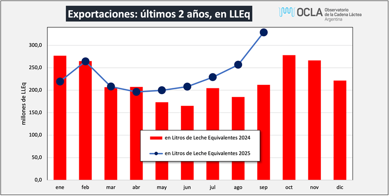 En litros de leche equivalentes a septiembre de 2025, fueron superiores (+55,1%) en el interanual y representaron el 29,5% de la producción total (en sep de 2024 representaron el 20,9%).