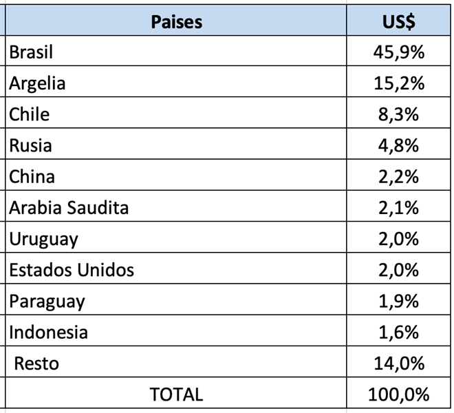 El destino de las exportaciones (en función al monto en dólares) se conformó: