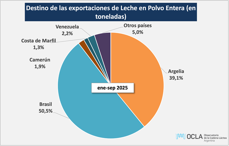 En enero-septiembre se dio una participación de Brasil del 50,5% y de Argelia del 39,1% para Leche en Polvo Entera, siendo ambos los principales destinos habituales de exportación de nuestro productor más significativo en las exportaciones.