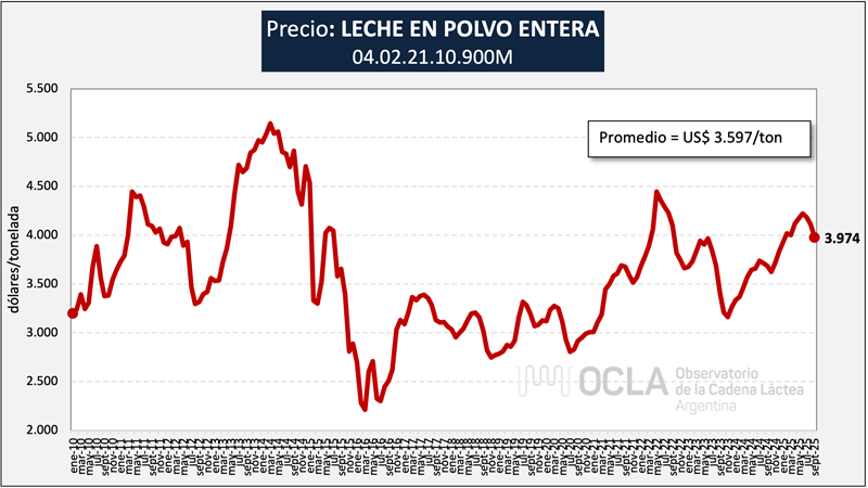 En el gráfico siguiente se puede observar la evolución del precio de la Leche en Polvo Entera en bolsas de 25 kgs. con el nomenclador Común Arancelario 04.02.21.10 900M actualizado hasta el mes de septiembre de 2025: