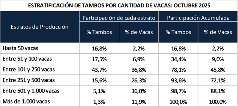 Abajo la estratificación en función a la cantidad de vacas, indicando la participación en función a la cantidad de tambos y luego de animales en producción. Como más significativo puede mencionarse que los tambos con más de 500 vacas totales en producción son sólo el 6,4% de los tambos, pero tienen el 27,9% de las vacas y aportan más de un tercio de la producción total de leche. En el otro extremo se encuentran los tambos de menos de 100 vacas totales en producción que son el 34,3% de los tambos, tienen el 9,1% de las vacas y generan menos del 10% de la producción total.