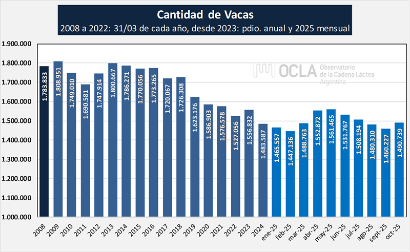 Con la información disponible de algunos meses, principalmente a marzo de cada año previas a contar ahora con el Tablero Dinámico Mensual podemos extrapolar por tendencia los meses previos. En base a lo descripto, la variación respecto al mes anterior es de -0,09% unidades productivas y +2,09% de vacas. La variación interanual de octubre 2025 respecto a octubre 2024 es de -2,58% unidades productivas y -1,16% de vacas (17.449 cabezas menos que octubre 2024, y 11.909 cabezas más que en octubre de 2023).