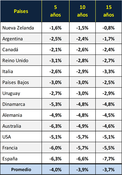 En el gráfico y cuadro siguiente, sobre la base de la cantidad de unidades productivas de los últimos 15 años, se calcula la tasa anual para el período de 5, 10 y 15 años respectivamente, donde se puede observar el promedio simple de la tasa de disminución de tambos de los países disponibles que asciende al 4,0% anual en los últimos 10 años.