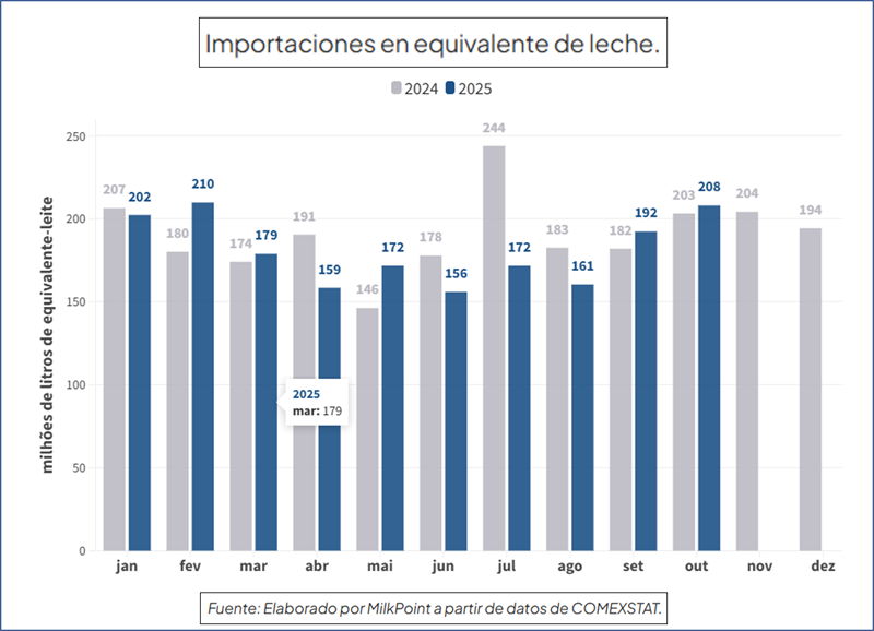 Las importaciones aumentaron aproximadamente un 8,2 % en octubre, alcanzando un total de 208,1 millones de litros durante ese período. En comparación con octubre del año anterior, el aumento fue menor, en torno al 2,3 %. Sin embargo, en el período acumulado de enero a octubre de 2025, las importaciones registraron una disminución del 4,1 % con respecto al mismo período de 2024.