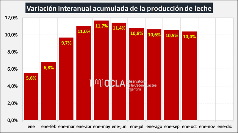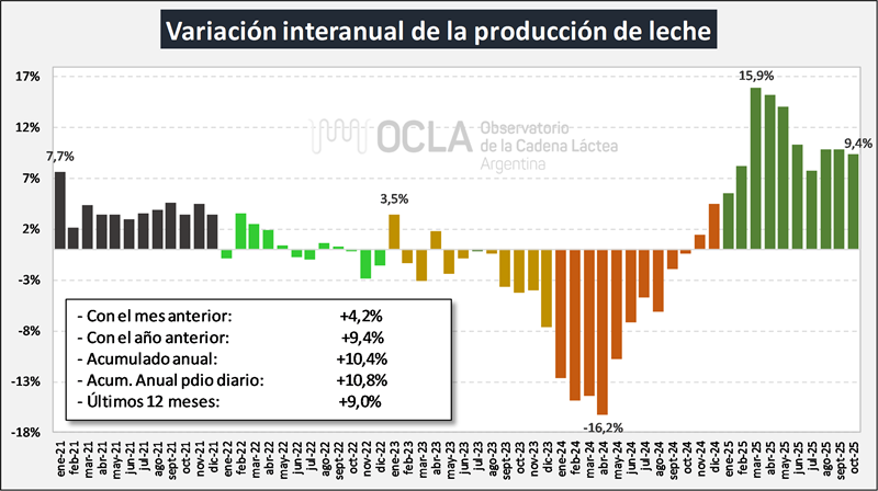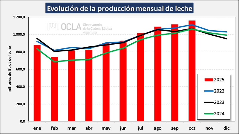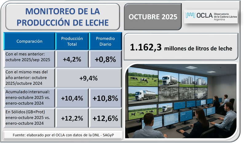 En el mes de octubre del 2025 la producción fue de 1.162.323.285 de litros de leche, esto implica un valor 4,2% por encima del mes anterior (+0,8 en el promedio diario), un 9,4% más que igual mes del año anterior y el acumulado de los diez meses transcurridos del año subió un 10,4% respecto al 2024 (+10,8% en el promedio diario).