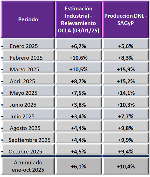 La estimación para el año 2025 en base a datos de la industria publicada por OCLA el 03/01/25 preveía un aumento del 4,5% para octubre. Para el período enero-octubre esa estimación fue de +6,1%, superada con los números actuales ya que ascienden a 10,4%.
