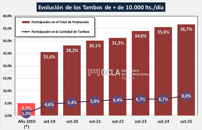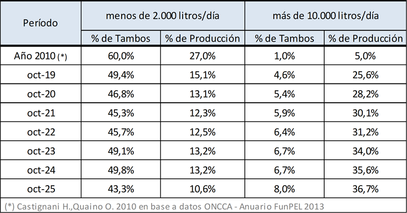 Entre 2010 y 2025 los tambos de menos de 2.000 litros de producción diaria venían reduciendo significativamente su importancia relativa en la producción de leche total y los tambos de más de 10.000 litros diarios de producción, multiplicaron por 8 su participación en la producción y la cantidad de tambos, a pesar del efecto de caída de la producción total que se dio en 2024.