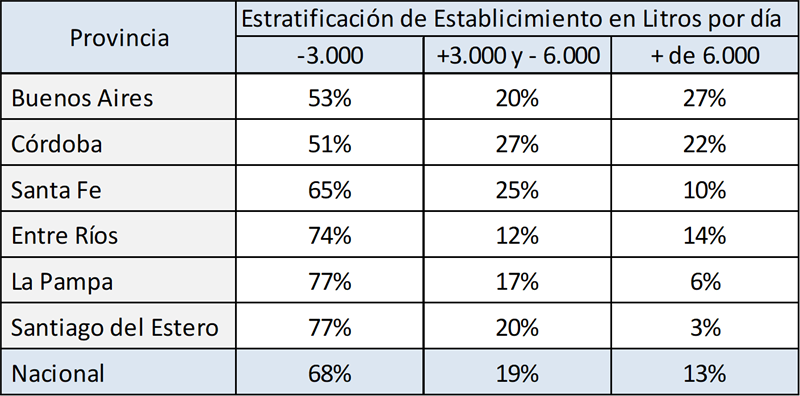 Por su parte, en el cuadro siguiente se puede ver la distribución de los tambos por provincia en base a su tamaño, y se puede concluir que los tambos más grandes están principalmente en Buenos Aires, seguido por Córdoba y el resto de provincia se caracteriza por una prevalencia de tambos de menos de 3.000 litros diarios.