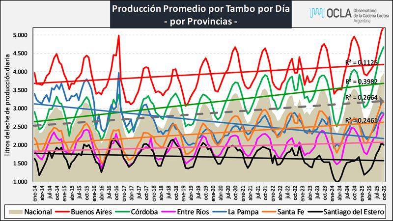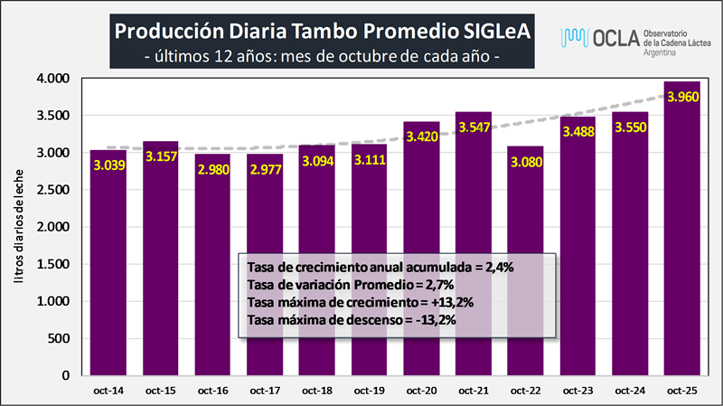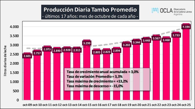 Sobre la base de la producción mensual y la cantidad de tambos (SENASA), podemos inferir el tamaño del tambo promedio, unos 4.194 litros de leche diarios para octubre de 2024, una producción 12,3% superior al año anterior. En el período 2016-2025 el tambo promedio creció a una tasa del 4,6% anual.