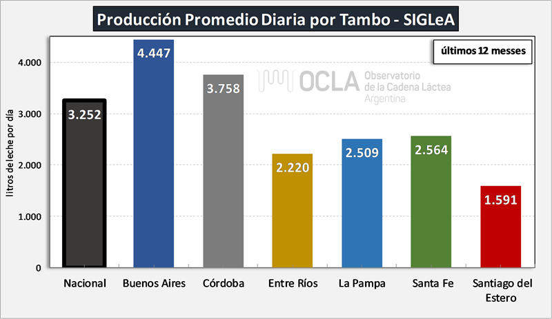 La producción promedio diaria por tambo y por provincia que graficamos aquí es la que arrojan los datos de SIGLeA – LUME y se toma el promedio de los últimos 12 meses (noviembre/24 – octubre/25). Los datos SIGLeA – LUME del último mes provienen de 7.534 liquidaciones, 377 industrias lácteas.