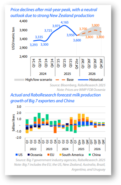 Nuestro escenario base prevé precios más bajos hasta 2026, impulsados por un mayor excedente de leche exportable.