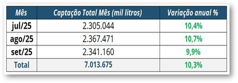 Este movimiento se alinea con las expectativas para la recolección de leche de este año, consolidando este período como el tercer trimestre de mayor volumen en la serie histórica desde 1997 y confirmando el escenario de mayor producción de leche registrado en Brasil.