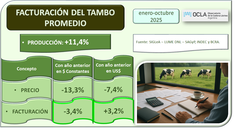 El tambo promedio SIGLeA-LUME que en octubre de 2025 tuvo una producción diaria de 3.960 litros, facturó un 7,1% por debajo del año anterior. En el acumulado del período enero-octubre, medido en moneda constante facturó un 3,4% por debajo de igual período del año anterior debido a una baja en el precio de 13,3% pero con una mejora de producción del 11,4%. En dólares en ese período la facturación fue 3,2% superior a igual período del año anterior.