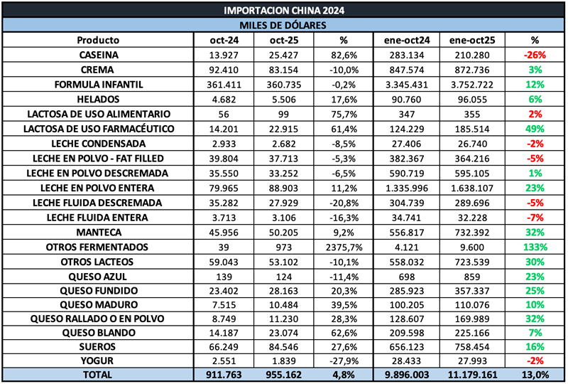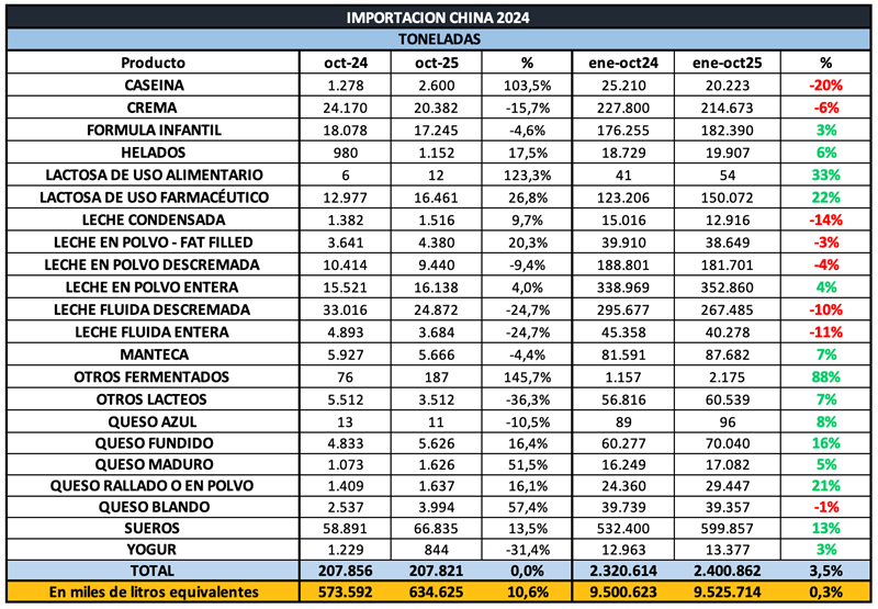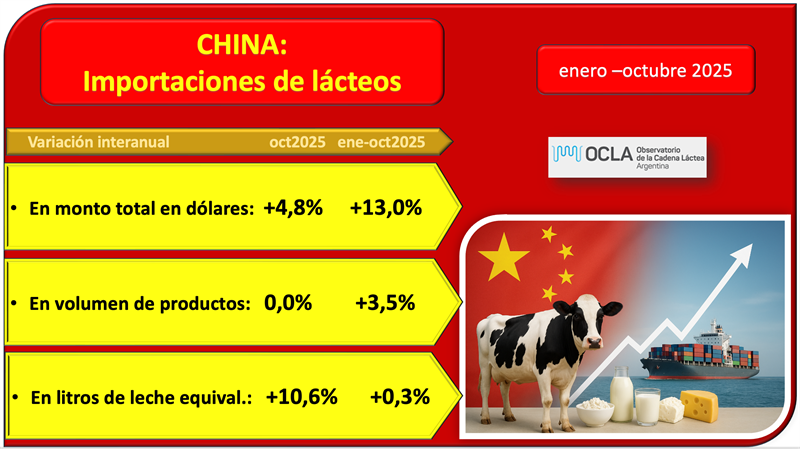 • CHINA: importaciones de productos lácteos a octubre de 2025 25/11/2025