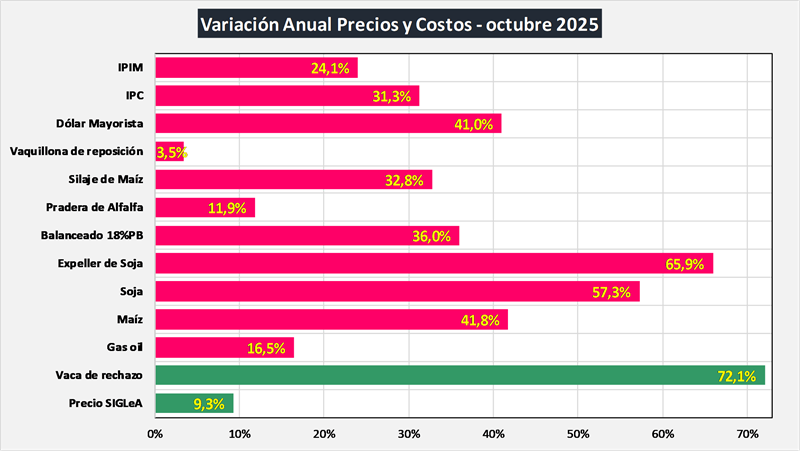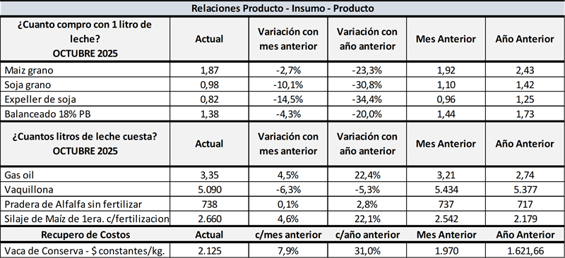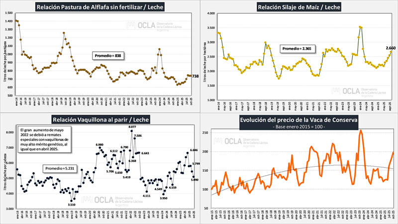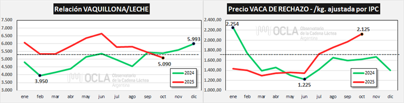 Hay otros insumos como la vaquillona de reposición, que juega un rol importante en los costos, viene bajando en litros de leche lo cual atempera la suba de los costos. Por su parte, la vaca de rechazo, que interviene en el análisis como un recupero de costos (es un ingreso indirecto), vino subiendo en moneda constante y por ende reduce los costos de producción de leche.