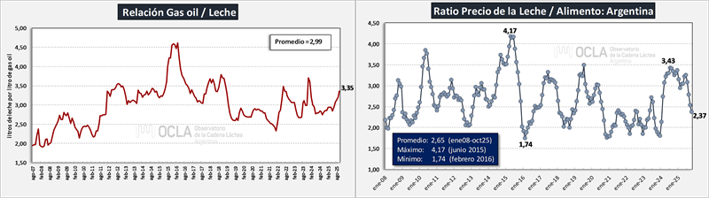 Como venimos mencionando en nuestros informes de Facturación del Tambo Promedio y Costos Regionales de Producción, el ajuste de los precios por debajo de la inflación y un aumento en algunos insumos clave, deteriora las relaciones de precios producto-insumo como vemos en los gráficos superiores. El maíz, insumo fundamental en la alimentación del rodeo, que tuvo durante gran parte de 2024 y 2025 relaciones muy por encima de 2 a 1, en los últimos meses ha roto esa barrera que comienza a indicar lo que marcan los costos, que se vienen emparejando con los precios e incluso los superan en algunos estratos de tambos.