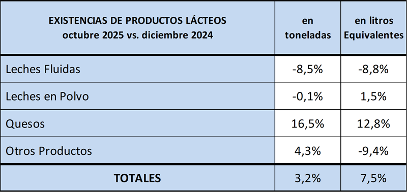 Las existencias fueron en octubre pasado un 3,2% en volumen de producto y 7,5% en litros de leche equivalentes, superiores a las iniciales del año (01/01/25).