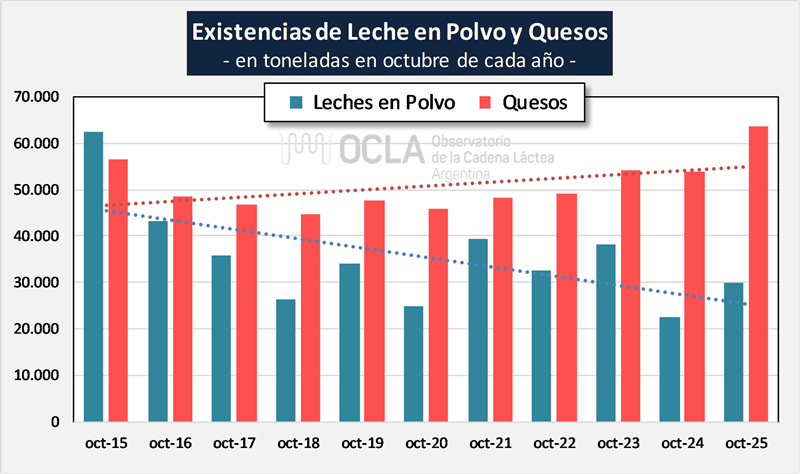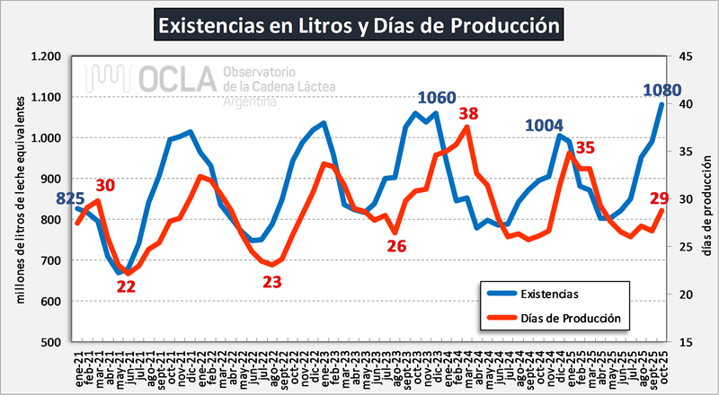Las existencias en octubre llegaron a 1.080 millones de litros de leche equivalentes y en la comparación interanual oct/25-oct/24, los stocks fueron un 15,7% superiores en volumen y 20,7% en LLEq.