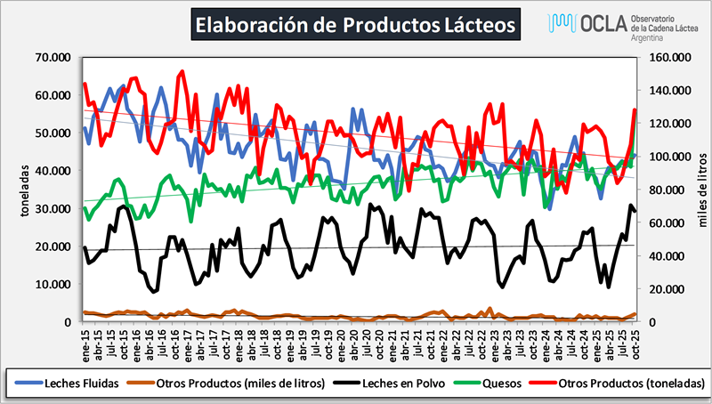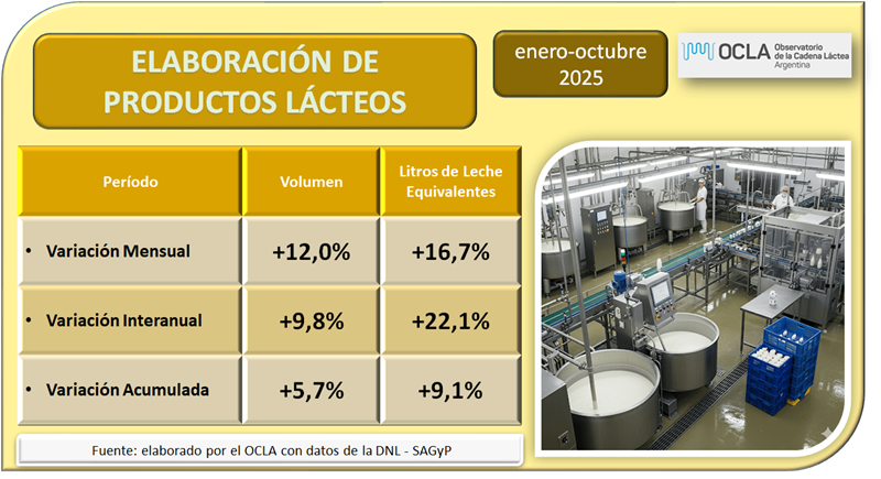 La elaboración según la Resolución 230/16 de la DNL presentó para el mes de octubre de 2025 un volumen 12,0% superior al mes anterior y en litros de leche equivalente un 16,7% más (+12,9% en el promedio diario).